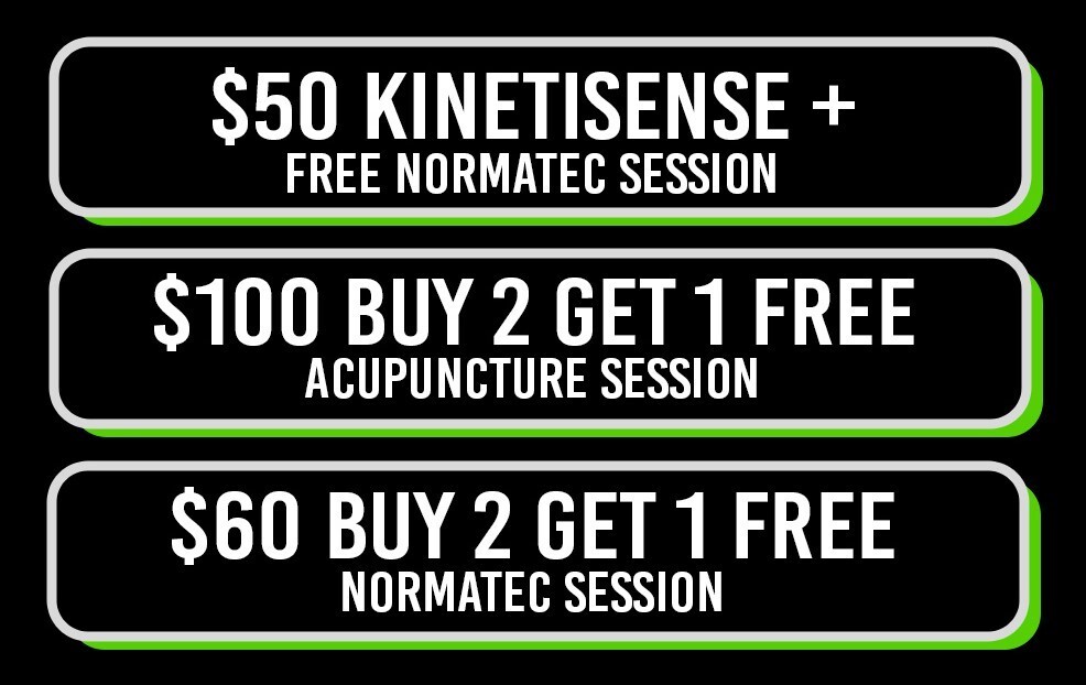 Normatec pneumatic compression massage increases blood flow, flushes lactic acid & reduces inflammation. We have both hip & lower body attachments!